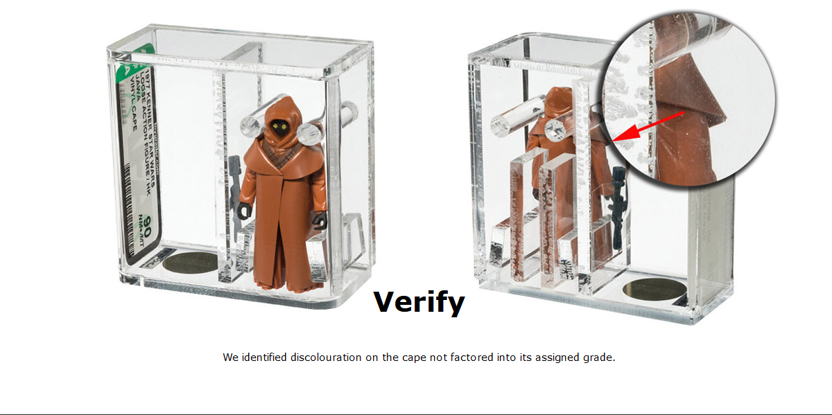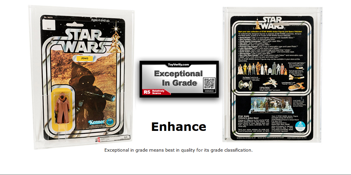 In instances where the item demonstrates a quality which surpasses it's assigned grade, we would identify it to be an "Exceptional In Grade" specimen. In certain instances where it may apply, ToyVeriify may also assign an item with an R rating using a numeric value of 1 to 5, where 1 represents Unique, and 5 represents Uncommon. The ToyVerify rarity index compares the items against collected data, using factors such as original production runs, distribution, extant examples, completeness and sealed state, just to name a few. All items are reviewed, researched, and assessed solely through the submission of photos. At its discretion, ToyVerify may require taking added measures to perform its assessment as accurately and professionally as possible, and this may mean using a magnification app, do a video call, or to take a video of the item. All submissions include an appraisal of the item, a digital badge, and a ToyVerify code which can be used through our website to search updated values for a period of up to 60 days.